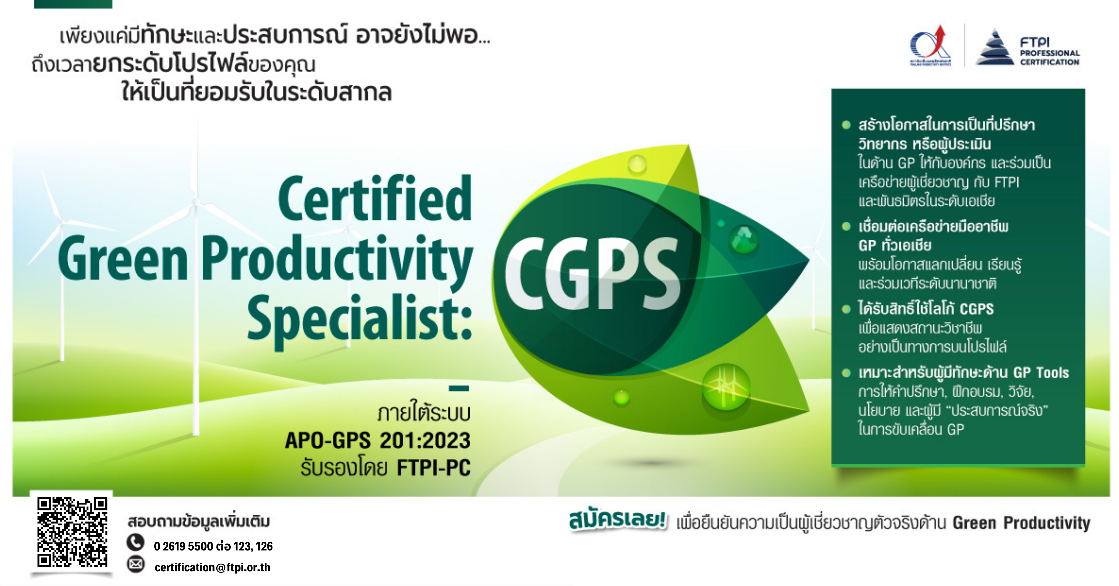• สำหรับผู้ที่ต้องการเติบโตต่อในสายอาชีพ สามารถต่อยอดสู่การรับรองระดับ Certified Master Green Productivity Specialist (CMGPS) ได้ในอนาคต