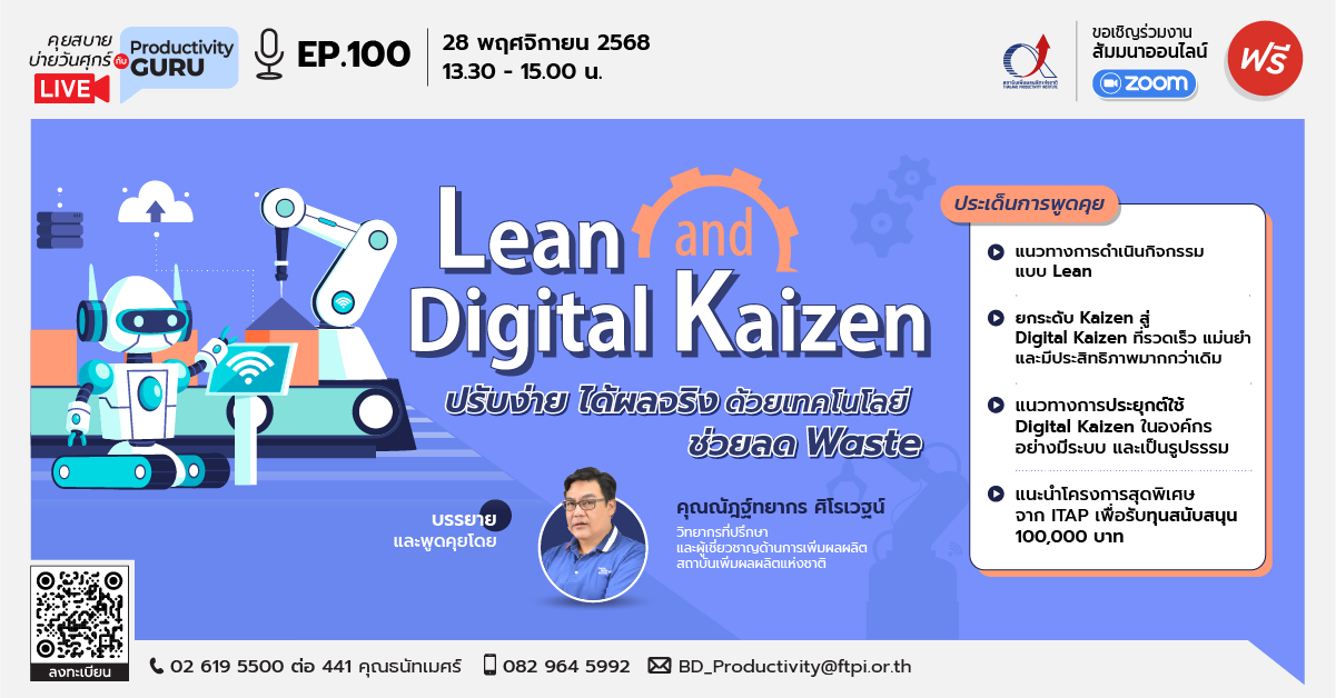 คุยสบาย บ่ายวันศุกร์ กับ Productivity GURU Ep.100 “Lean and Digital Kaizen ปรับง่าย ได้ผลจริง ด้วยเทคโนโลยีช่วยลด Waste” สัมมนาฟรี ไม่มีค่าใช้จ่าย